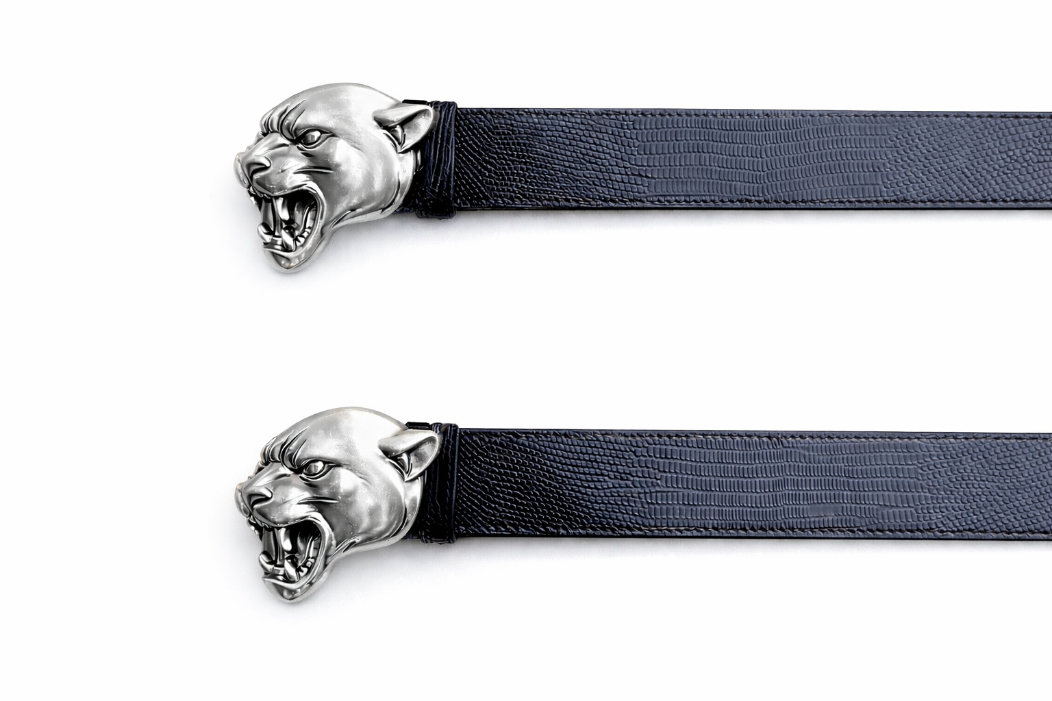 Sleek Silver panther buckle made with zinc alloy, paired with black snake skin-print PU leather. A versatile, high fashion accessory blending street and luxury aesthetics.